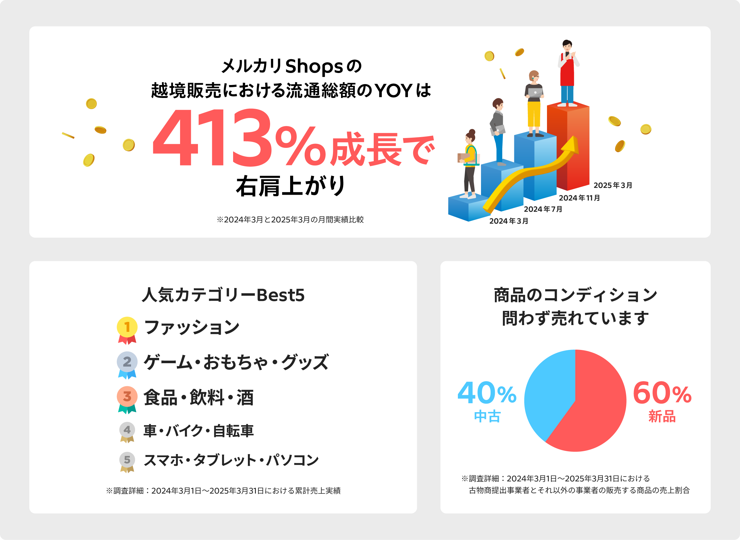 毎月2,300万人以上がお買い物を楽しむメルカリに商品を掲載できるから、お買い物意欲の高いお客さまとマッチングしやすい状態です。また、毎月特集やキャンペーンを開催しているので、エントリーすることで集客を見込めます。